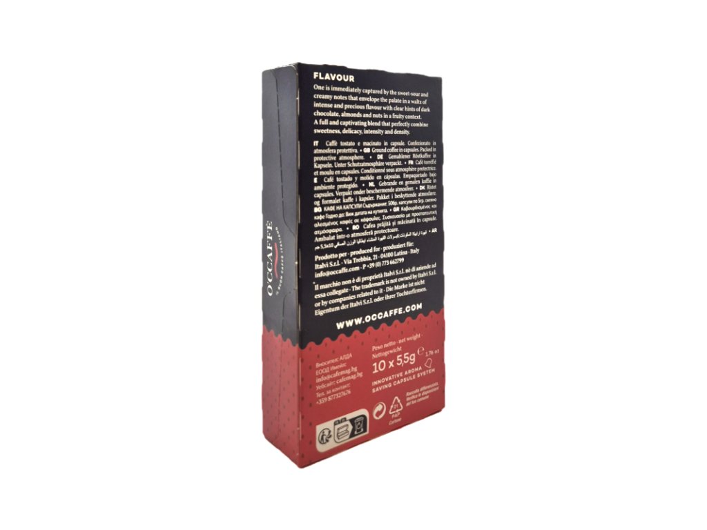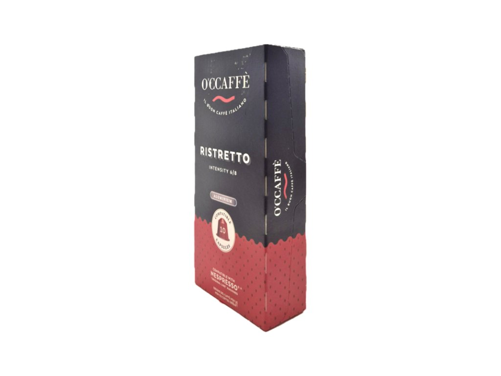 Kapsle O´Ccaffé Ristretto obsahuje 80% Arabica a 20% Robusty. Sladkokyselá krémová chuť, která je doplněna náznaky hořké čokolády, mandlí a ořechů. Tato podmanivá plná směs dokonale spojuje sladkost, intenzitu, jemnost a hustotu. Káva je uzavřena v kvalitních hliníkových kapslích pro maximální uchování čerstvosti a aroma.