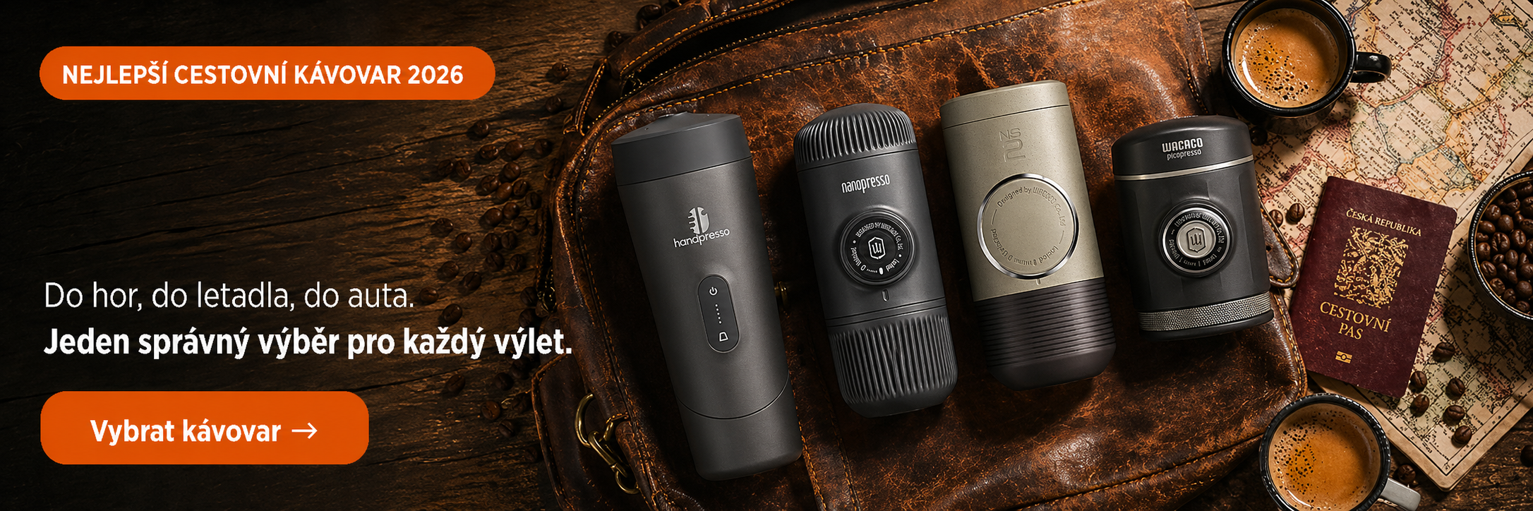 Nejlepší cestovní kávovar pro většinu lidí: Wacaco Nanopresso. Lehký, jednoduchý, funguje s kapsulemi i mletou kávou, 18 bar tlak. Vezmeš ho kamkoliv. 🏆